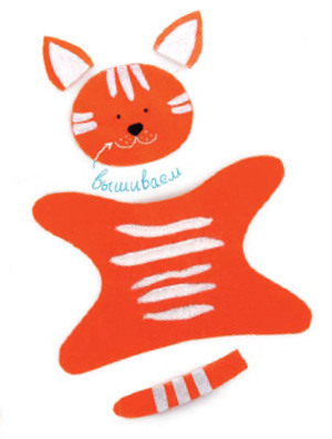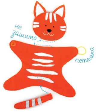 - Слегка набейте голову, туловище и хвост котенка синтепоном и сшейте все детали вместе. Наш озорной котенок готов!