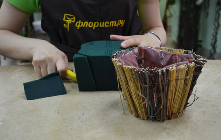 - Готовый оазис обрежьте и поместите в кашпо. До того чтобы вода с оазиса не стекала, обложите кашпо изнутри влагонепроницаемой пленкой.