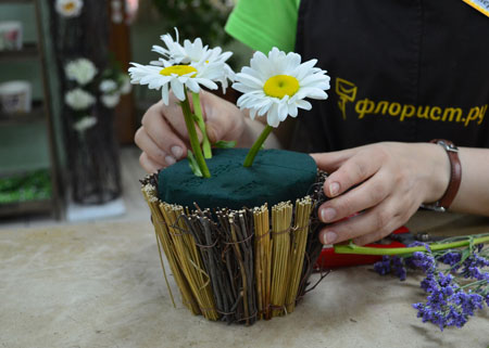 - Теперь можем приступить к оформлению композиции. Первым делом расположим самые крупные цветы — у нас это маргаритки. Вы же можете взять любые цветы, которые растут у вас в саду. Располагать цветы лучше всего не в самом центре, а по всей площади композиции.