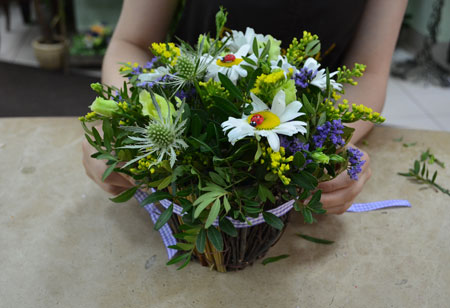 - Чтобы заполнить пустые места в композиции и сделать ее «зеленой», добавьте между цветами веточки писташа. Чтобы добавить в композицию яркости, прикрепите к нескольким цветам декоративных божьих коровок, а кашпо обвяжите цветной декоративной ленточкой.