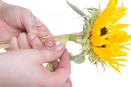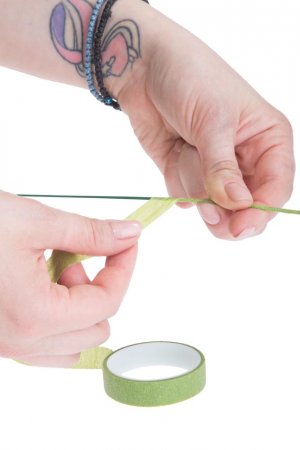 - Теперь подготовим к работе подсолнухи: с помощью тейп-ленты примотаем к их стеблям шпажки. Таким образом мы сможем выпрямить каждый подсолнух и создать ему крепкий ствол.