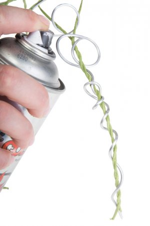 - Переходим к декоративной проволоке, крепим ее на ручку каркаса, далее обматываем вокруг готового элемента из ромбов. Делаем это хаотично, по спирали. Много материала используем именно у основания букета — таким образом в композиции будет больше черного цвета, что создаст устрашающий облик букета на Хэллоуин.