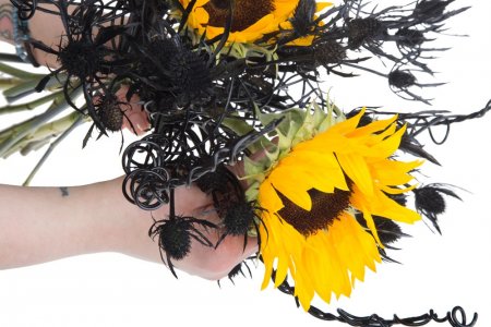 - Собираем цветы в букет: правой рукой держим композицию, левой добавляем новое растение, все цветы распределяем чуть ниже центрального растения. Равномерно чередуем подсолнух, астранцию, эрингиум.