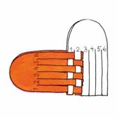 Возьмем по половинке в каждую руку и проденем белую полоску № 1 под красную № 6, а затем вытащим из-под нее и снова вставим под красные полоски, с пятой по первую.