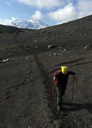 Из путевых заметок о. Дмитрия: Группа почти сразу делится на две части: основную, которая идёт в темпе инструктора Максима, и «Группу здоровье» (как мы сами себя назвали), которую замыкает инструктор Егор. Светит солнце, видны все вулканы вокруг. Красота! Однако уже через час, когда мы заходим за очередной гребень Корякского вулкана, на нас набегает тучка, а затем начинает моросить, а затем — дождь, в течение дня такая ситуация повторяется раз пять. Солнце виднеется где-то в долине, но тучка от нас не отстаёт. Вскоре на дождь мы перестаём обращать внимание, поскольку промокаем почти полностью. Всё это сопровождается совершенно чудесными неземными видами на долину, вулканы, ручейки и речки из талой воды, выбегающие прямо из-под снежных полей, камни, рассыпанные по чёрным вулканическим полям, маленькие, но героические растения, произрастающие среди черно-белой пустыни. С горки на горку, с горки на горку, с горки на горку…