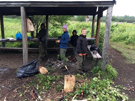 Детское дежурство: София, Вера, Федор Березины и еще один юный участник похода Влад без посторонней помощи должны накормить всех завтраком – макаронами с сыром. Дежурные встают в 6 утра, разжигают костёр, отмывают в ручье вчерашние котлы, варят макароны, нарезают сыр — любо-дорого смотреть. К моменту пробуждения лагеря вкусный завтрак готов. Но где-то рядом могут бродить медведи… Папа тоже рядом, но он максимум имеет право давать советы и координировать процесс. После еды детям нужно помыть котлы, чтобы группа была готова к продолжению пути.