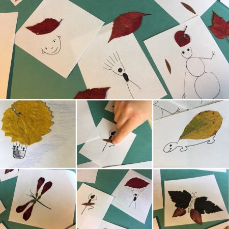 Нарисуйте основу для картинки сами или предложите нарисовать ребёнку так, чтобы дополнить ее недостающими деталями с помощью сухих листьев.