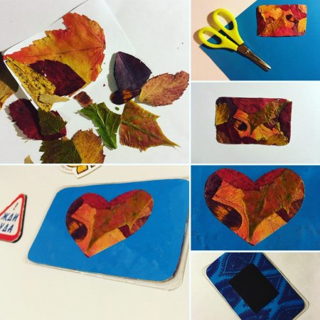 Если сухие листья переломались, не спешите их выбрасывать. Сделайте фон, наклеивая кусочки листьев на бумагу или картон, а сверху приклейте лист с вырезанным на нем рисунком. Заламинируйте или закрепите самоклеящейся плёнкой и приклейте с обратной стороны магнит — получится сувенир на холодильник.