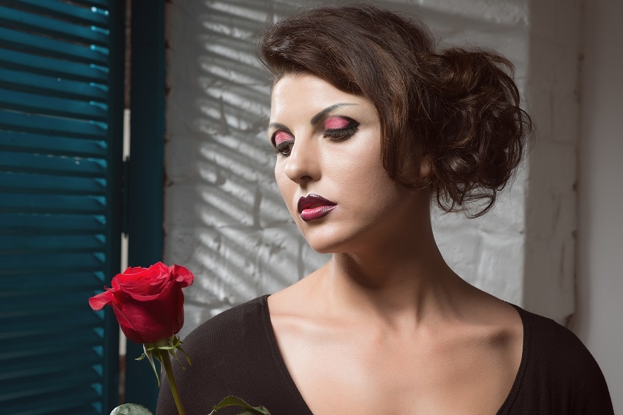Создавая образ в стиле pin-up для Марины, Анна Соловьёва использовала мягкое, почти незаметное скульптурирование, но при этом изменила природный тёплый тон модели на холодный в соответствии с жанровыми особенностями. Тональная основа нанесена не только на лицо, но и на шею, и на зону декольте. Акцент на глазах усилен при помощи накладных ресниц.