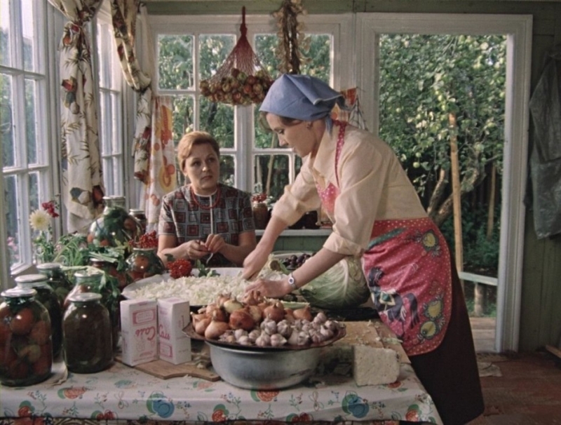 Пироги, блестящий паркет и крахмальное белье — вот оно счастье, нет его краше. У всех наглажены рубашки, котлеты нажарены на неделю, а мать семейства в фартучке с оборками хлопочет, хлопочет, хлопочет, улыбается и машет. А если нет — муж и дети голодны, унылы и угрюмы.