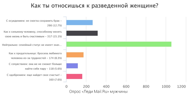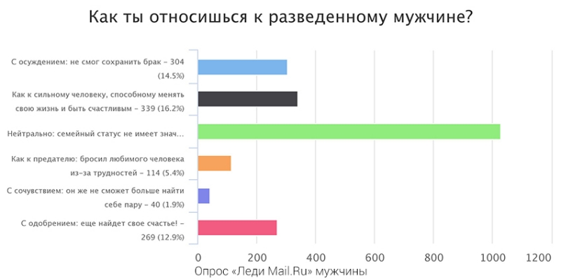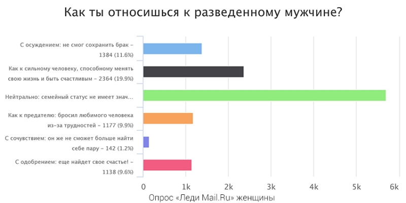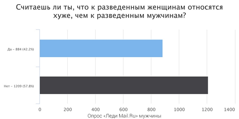 Отличается ли все же отношение к разведенным мужчинам и женщинам? Мнения разделились. Мужчины в основном ответили, что семейный статус не имеет значения. А женщины относятся к разведенным — как к сильным личностям, способным менять свою жизнь.