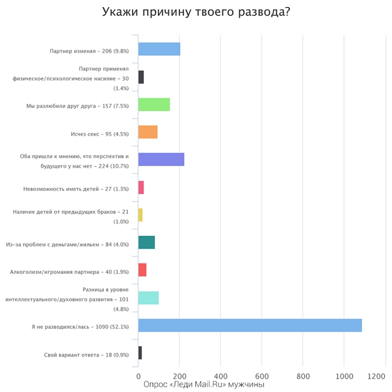 Среди причин развода (которого, судя по статистике, опрошенные все же хотели бы избегать), женщины чаще называют измены и алкоголизм партнера. А мужчины — ощущение, что у их семьи нет будущего и измены.