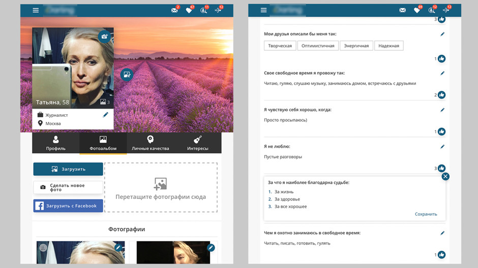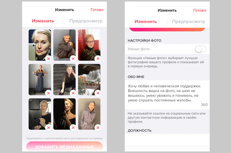 На обоих сайтах выложила фотографии, на которых я вполне узнаваема и морщины не зафотошоплены. Положенный в день десяток кандидатов лайкала без претензий к их внешности, но анкеты изучала скрупулезно! Писать первой не стеснялась — особенно тем, у кого лица добрые, а в анкетах что-то зацепило. И началось общение.