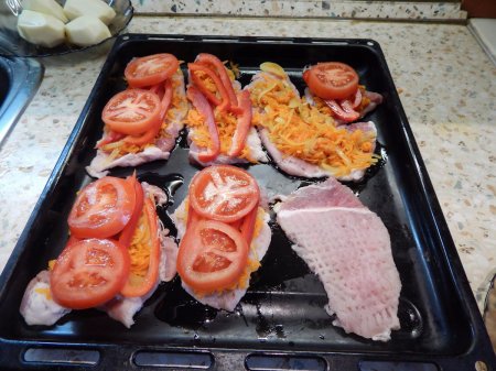 Мясо отбиваем, солим, перчим, кладем на противень. Овощи прикладываем на мясо: 1- лук с морковью. 2- перец болгарский.3-помидоры.