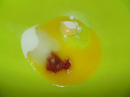 В миску разбиваем одно яичко(на данное количество всех ингредиентов я использую одно хорошее яичко), прибавляем мед.