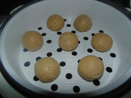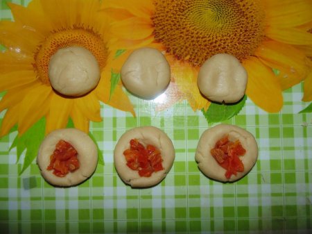 Полностью готовое тесто разделяем на порции. Формируем шарики, размером чуток меньше спичечного коробка. В каждом шарике делаем углубления и выкладываем начинку. Очень кропотливо защипываем края и опять формируем шарик, основное, чтоб не было "трещин", по другому при готовке, пряники раскроются в этих местах.
