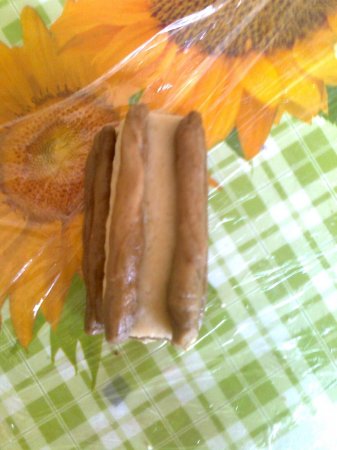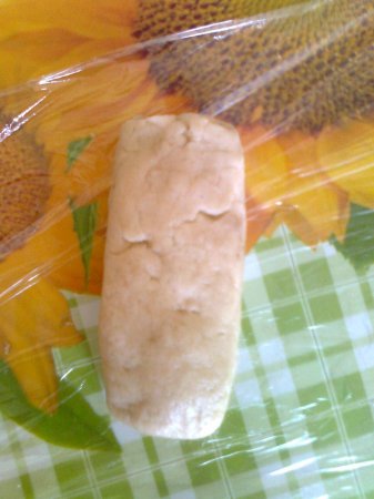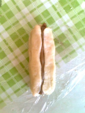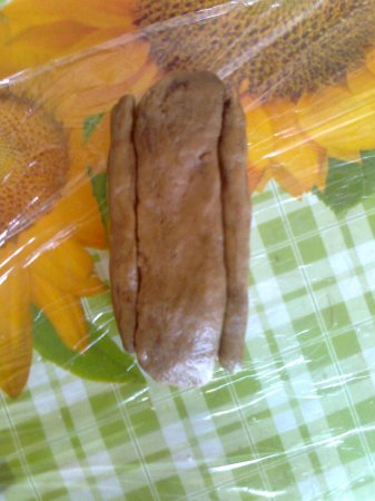 Растилаем пищевую пленку. Из маленького куска ясного теста формируем прямоугольную "колбаску", вышиной приблизительно 1,5-2 сантим., шириной 2-3 сантим., длиной около 5-7 сантим..