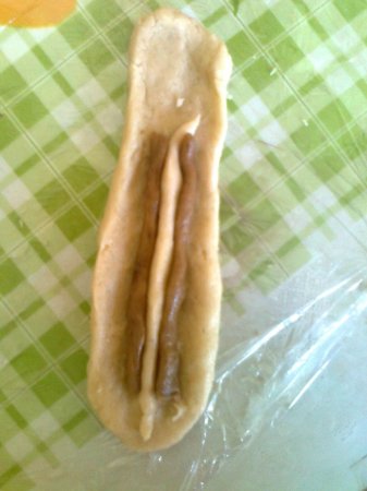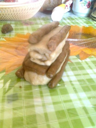 Поверх, по краям прикрепляем еще 2 колбаски темного теста.