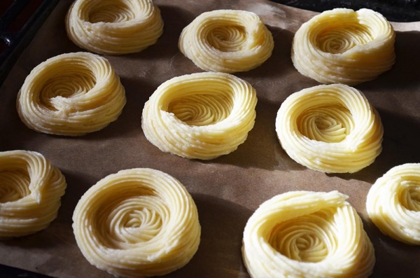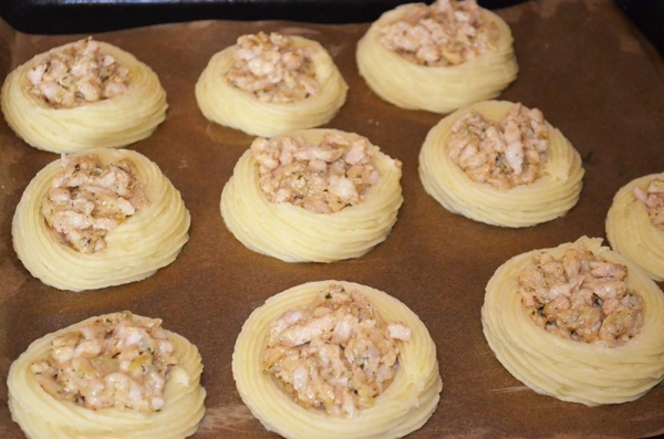Противень застелить пергаментной бумагой и смазать слив. маслом. Из картофеля сформировать гнёзда, кондитерским мешком, или просто ложкой.