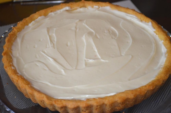 Через полчаса достаем тесто и сразу в форме для выпечки формируем корж с бортиками (для этого количества теста лучше использовать форму не меньше 26 см диаметром). Накалываем вилкой, сверху кладем пергамент с грузом (фасоль, горох) и выпекаем 15-20 минут, при 280 гр. Затем груз убираем и выпекаем корж до готовности, еще минут 15-20, ориентируйтесь на свою духовку, корж должен зарумяниться. Готовый корж нужно остудить.