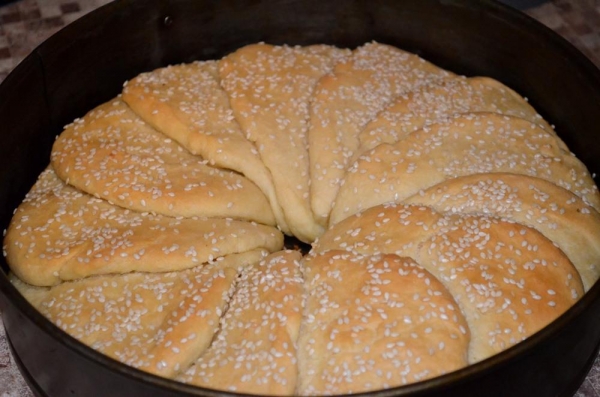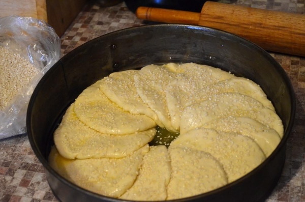 Каждую лепешку, обильно смазать растопленным сливочным маслом и выложить в круглую форму внахлест. Посыпать кунжутом. Накрыть полотенцем или пищевой пленкой и поставить в теплое место, на 20-30 минут.