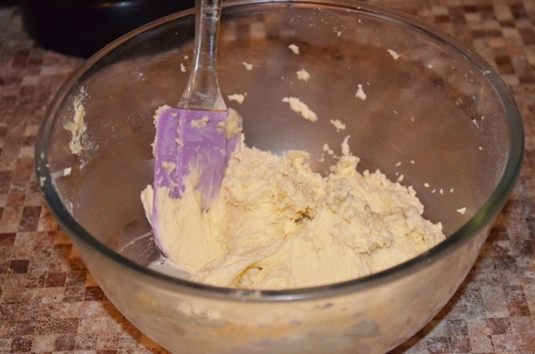 Размягченное сливочное масло взбить с сахарной пудрой и ванилином до пышной белой массы. Затем добавить муку, хорошо все смешать миксером (от качества муки, зависит на сколько растечется печенье, поэтому советую начинать делать с этого количества ингредиентов, чтоб понять, сколько нужно добавлять муки. Если сильно растекается, значит муки нужно добавлять чуть больше).