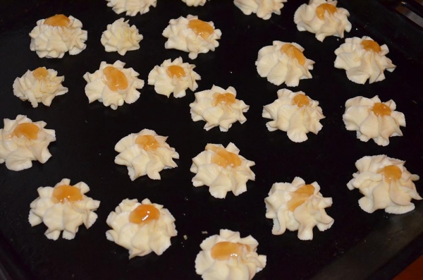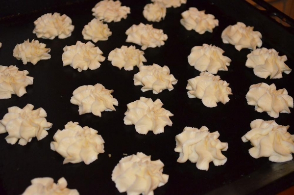 С помощью кондитерского мешка отсаживаем печенье на противень (можно застелить пергаментом), Лучше формировать высокие печеньки, потому что в этом рецепте они должны чуть растечься.