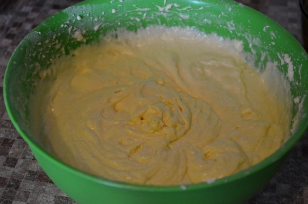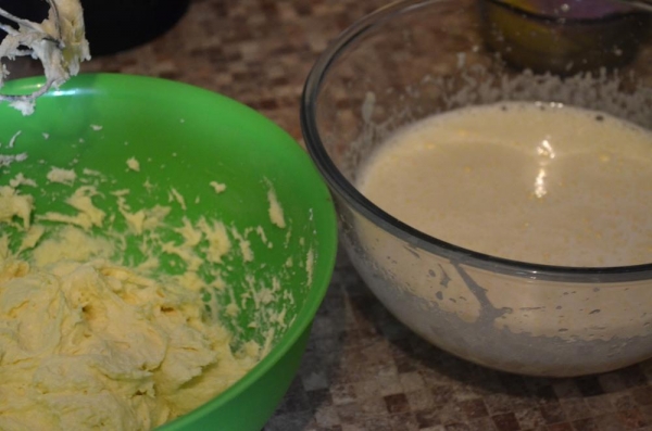 Затем смешиваем эти две массы, и добавляем муку с разрыхлителем.