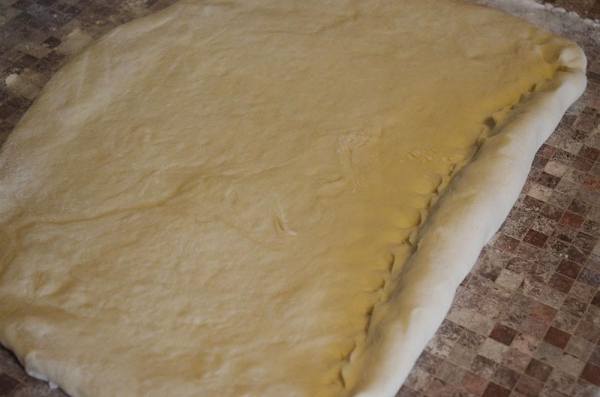 Поднявшееся тесто раскатываем в пласт и сворачиваем рулетом, зажимая край, после каждого оборота.