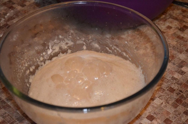 В теплой воде развести дрожжи, добавить сахар и столовую ложку муки. Оставить на 20 минут.
