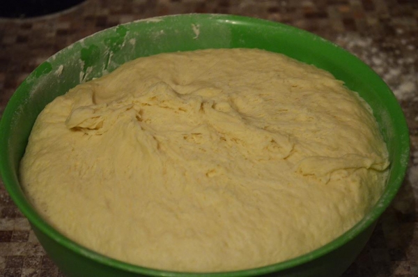 Добавить опару, замесить тесто. Убираем в теплое место, на час. Вот так оно выглядит после подъема.