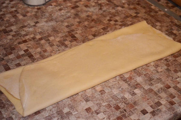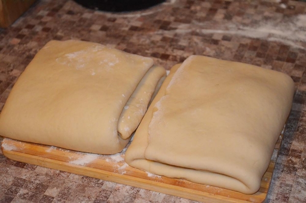 Подошедшее тесто делим на 2 равные части. Раскатываем прямоугольник, смазываем растопленным слив. маслом и складываем в 4 раза. Тоже самое делаем со второй частью теста.