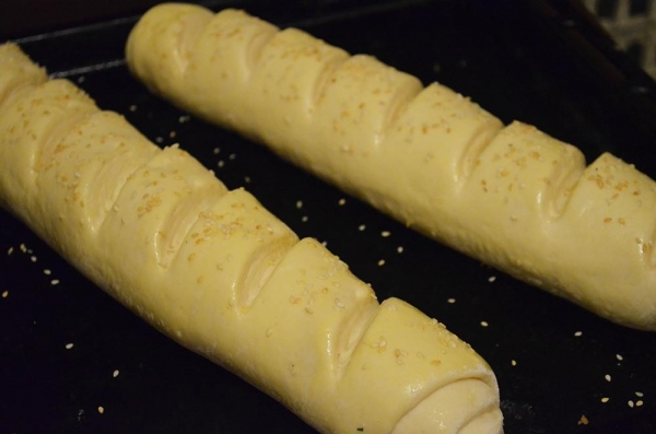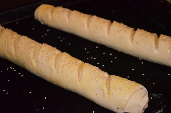 Категория рецептов: Выпечка и сладости Рекомендуется детям: 2 - 3 года, от 3 лет Время приготовления: 2 часа 30 минут Ингредиенты молоко 200 грамм яйцо 1 штука вода 70 грамм масло сливочное (в тесто для смазки) 20 50 грамм сахар 1 ч. ложка соль 0,5 ч. ложек мука (примерно) 500-600 грамм кунжут (по желанию) 2-3 ст. ложки желток (для смазки) 1 штука Процесс приготовления 1 В теплой воде развести дрожжи, добавить сахар и столовую ложку муки. Оставить на 20 минут. 2 400 грамм муки, смешать с солью, теплым молоком, яйцом и размягченным слив. маслом (20 гр). 3 Добавить опару, замесить тесто. Убираем в теплое место, на час. Вот так оно выглядит после подъема. 4 Подошедшее тесто делим на 2 равные части. Раскатываем прямоугольник, смазываем растопленным слив. маслом и складываем в 4 раза. Тоже самое делаем со второй частью теста. 5 Кладем конверты на доску, накрываем полотенцем и убираем в холодильник на 15-20 минут. 6 Достаем из холодильника и каждый конверт раскатываем в пласт, снова смазываем слив. маслом и закручиваем в рулет. Делаем характерные надрезы. Смазываем желтком, посыпаем кунжутом и оставляем в теплом месте на полчаса. 7 Через полчаса ставим в духовку, на 30-40 минут, при 180 гр. 8 Приятного аппетита!
