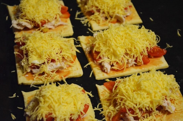 Смазываем каждый квадратик томатным соусом, выкладываем начинку: перец - курица - помидоры - йогурт (сметана) - сыр.