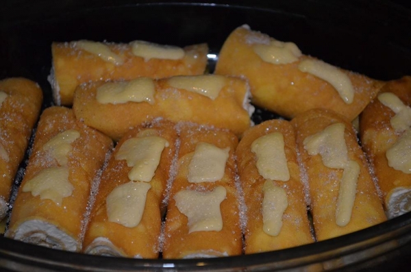 Свернуть рулетом, разрезать пополам, выложить в огнеупорную форму, сверху на каждый рулетик положить немного сливочного масла, посыпать сахаром.