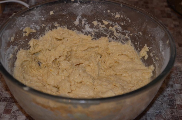 Смешать масляную массу с мучной. Тесто получается достаточно густое.