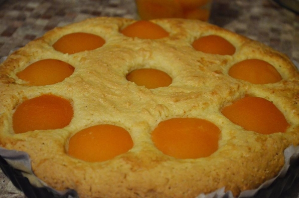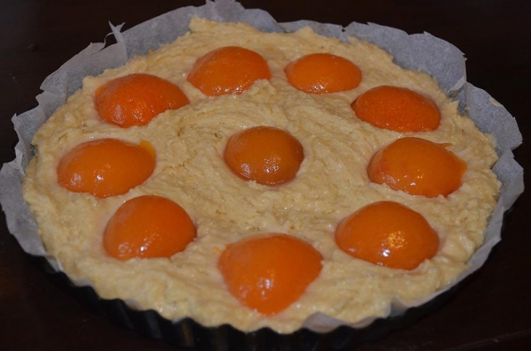 Форму (22 см диаметром) застилаем пергаментом, выкладываем тесто, разравниваем, сверху кладем половинки абрикосов, немного вдавливая