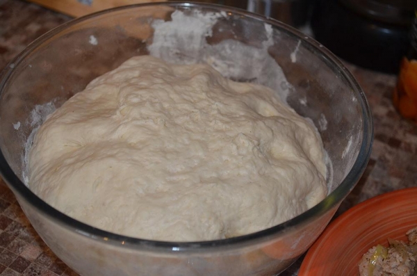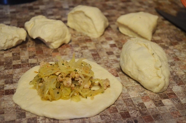 Стол и руки смазать растительным маслом. Разделить тесто на порции, руками сформировать лепешку, в центр выложить начинку (1 ст. л. с горкой) и слепить пирожок.