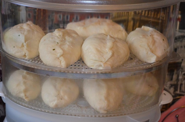 Посуду, в которой будете готовить, смазать растительным маслом. Пирожки эти готовятся на пару, так что понадобится пароварка или мантышница. Выкладываем пирожки в пароварку (не очень близко друг к другу, у меня немного слиплись).