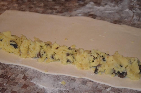 Лук мелко порезать, пожарить до золотистого цвета и смешать с картофельным пюре (я взяла грибы вместо лука). Тесто разделить на две части, раскатать тонко, выложить начинку и свернуть рулетом.