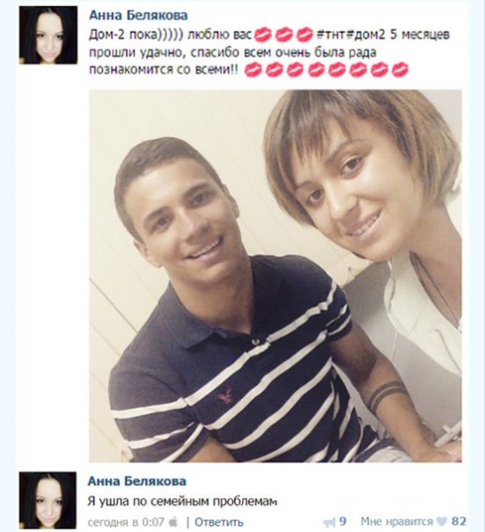 Недавно Анна Белякова сумела встретить на проекте свою любовь. Этим молодым человеком оказался вовсе не Николай Должанский , хотя девушка приходила именно к нему и даже собиралась стать его женой. Свое сердце она подарила Арсению Ефименкову , с которым сразу же заселилась в отдельную комнату, и казалось, была счастлива. Однако чуть позже выяснилось, что за периметром у Сени была девушка, которая захотела прийти к своему возлюбленному на скандальную телестройку, поэтому парень быстро отказался от Ани и принялся ждать Анастасию. Волей судьбы случилось так, что эта дамочка так и не попала на съемочную площадку, а Ефименкову ничего не оставалось делать, как уйти с проекта по собственному желанию, ведь с того момента коллектив его невзлюбил. Две недели он жил счастливо с Настей, пока в один прекрасный день она его не бросила, заявив, что все чувства прошли. Поэтому молодой человек опять начал искать встреч с Беляковой и даже пригласил ее на ночную прогулку по Москве. Многие начали подозревать, что Арсений опять хочет использовать Анну как «проходной билет», чтобы вернуться на Дом 2, однако участница уверила и своих коллег, и телезрителей, что они с Сеней всего лишь друзья, и он возвращаться в периметр не желает. Некоторое время она словно тень жила на съемочной площадке, с каждым днем становясь все тоньше и грустнее, а вчера вечером на Лобном месте девушка сделала заявление о том, что навсегда покидает проект. Аня разместила интригующую фотографию с Арсением Ефименковым. Возможно, так она намекнула, что они с Арсением поняли, что любят друг друга, поэтому попробуют построить свои отношения еще раз, но уже без телекамер и всевозможных провокаций, с которыми им приходилось сталкиваться на Доме 2. Однако позже Аня написала на своей стене, что ушла из-за проблем в семье. А как сложится дальнейшая жизнь этой парочки, наверняка уже очень скоро узнаем. А вы жалеете, что Аня Белякова ушла с проекта?