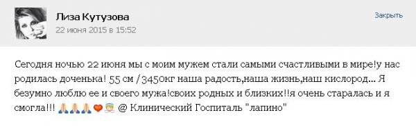 Экс-участница Дома 2 Лиза Кутузова родила дочь. Об этом молодая мама сообщила лично на страничке в соцсети. Рост крохи 55 см, вес - 3450 граммов. Звезда реалити-шоу признается, что она абсолютно счастлива, и уточняет, что важное для ее семьи событие произошло минувшей ночью в одной из столичных клиник. Напомним, что в конце апреля Кутузова сочеталась браком с певцом Ростиславом Пироговым . Свадьба прошла в узком семейном кругу, и невеста смогла скрыть свое заметное к тому моменту интересное положение, позируя в загсе и на банкете в выгодных для себя ракурсах. Таким образом о беременности Лизы не узнали даже ее преданные поклонники, и новость о материнство стала для них полной неожиданностью. Примечательно, что летом Кутузова и ее муж планируют организовать шумное свадебное торжество с большим числом приглашенных, которые не смогли присутствовать на официальной регистрации. Точную дату супруги не называли, но вероятнее всего, это решение заимело именно от даты родов Лизы. Теперь молодая мама сможет блеснуть в свадебном платье, продемонстрировав идеальную фигуру.