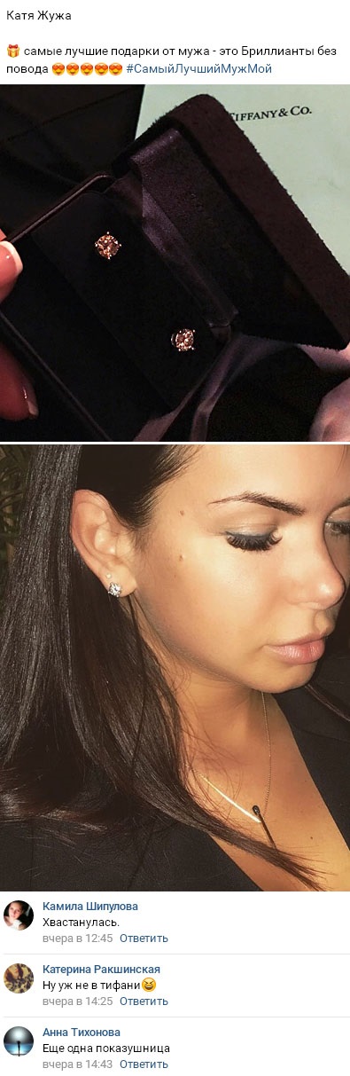 23 ноября 2016 года Екатерина Жужа охотно продемонстрировала всем шикарный презент от любимого человека. Еще совсем недавно Катя и Олег Винник прозрачно намекали своим фанатам на возможный разрыв, но теперь эти двое, напротив, показывают всем самые теплые и идиллические взаимоотношения. Ведущая новостей реалити-шоу похвасталась и подарком от Олега, которым оказались золотые сережки, включающие крупный бриллиант. Катя также настойчиво подчеркнула, что супруг просто решил порадовать ее без какой-либо определенной причины. Однако далеко не всем понравился презент, преподнесенный Винником жене, а Екатерину и вовсе обвинили в беспричинном хвастовстве и чрезмерной любви к показухе.