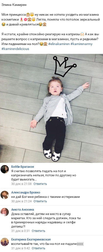 2 января 2017 года в результате одного случая, происшедшего в магазине, фанаты телестройки не могли не обратить внимания на то, насколько невоспитанной растет дочь Элины Камирен. Стремление Элины представить себя окружающим прекрасной матерью раз за разом завершаются неудачей. Всем уже известно о том, что почти все время маленькая Сашенька Задойнова проводит не в обществе матери и даже не под присмотром бабушки, Елены Николаевны Камирен. Девочка находится главным образом с няней, тогда как сама Элина гораздо охотнее посвящает свое время записи сомнительных видео, носящих откровенно порнографический характер, и другим занятиям, весьма далеким от воспитания ребенка. Читайте также: Элина Камирен осталась с маленькой дочерью без средств к существованию Исходя из информации, которую дала поклонникам сама Камирен, отсутствия внимания к малышке и соответствующего воспитания уже успело принести негативные результаты. Выяснилось, что перед самым наступлением Нового года Саша, которой едва успело исполниться два года, устроила подлинную истерику в магазине косметики, девочка не только категорически не желала уходить оттуда, но и бросилась на пол, стремясь обязательно настоять на своем. Хотя у самой Элины поведение Сашеньки вызвало лишь смех, фанаты искренне возмутились из-за того, насколько истеричной и не умеющей себя вести оказалась дочь Задойнова и Камирен. Свое мнение о том, уделяет ли Элина Камирен должное внимание воспитанию дочери, вы можете изложить в комментариях.