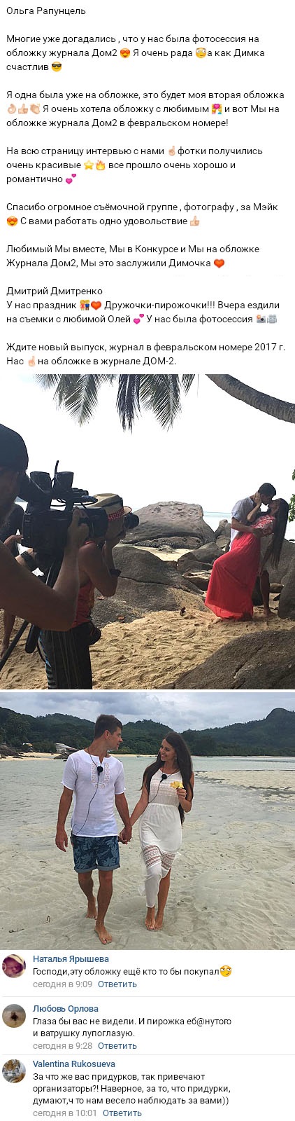 30 декабря 2016 года наконец осуществилось то, о чем давно мечтали как Ольга Рапунцель, так и Дмитрий Дмитренко. То, что сама Ольга полагает, будто она является звездой телешоу и даже основным проектным брендом, нисколько не мешает ее коллегам по периметру смотреть на это совершенно иначе. Ведущие телестройки также вовсе не считают, что Рапунцель чем-то существенно отличается от остальных участников, более того, они охотно подшучивают над девушкой при каждом удобном случае. Возможно, именно по этой причине появление ее фотографии на обложке проектного журнала стало для Ольги подлинным подарком по случаю Нового года. Еще больше девушку радует тот факт, что рядом с нею на обложке будет размещен и ее бойфренд Дмитренко. К тому же для них эта фотосессия для журнала оказалась первой, в которой они принимают участие совместно.