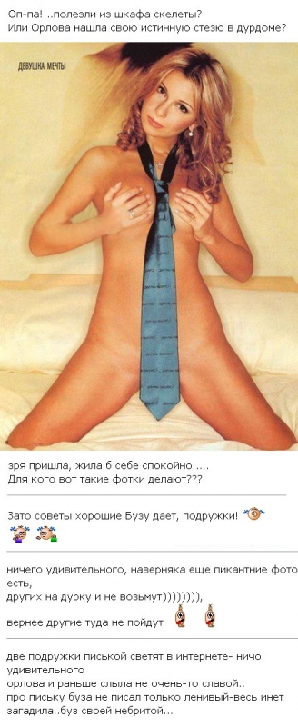 28 марта 2017 года в Интернете появился компромат эротического плана, касающийся Ольги Орловой, которую общественность привыкла считать весьма скромной и при этом достаточно мудрой женщиной. Общеизвестно, что приход Ольги на проект в качестве телеведущей пришелся по душе отнюдь не всем. Ведь саму Орлову фанаты телестройки и участники всегда считали человеком, весьма далеким от непростого мира реалити-шоу и того, что там происходит. Первые эфиры, в которых выступила бывшая солистка группы «Блестящие», оказались убедительным доказательством правильности данной позиции относительно этой молодой женщины. Но теперь, когда в Сети размещены весьма пикантные снимки новой ведущей телешоу, мнение многих резко изменилось. Вспомнив о не самом красивом прошлом Юлии Ефременковой, Ольги Рапунцель и еще некоторых участников, фанаты решили, что Орлова попала именно на свое, прекрасно подходящее для нее место. Однако посетители социальных сетей сразу же поторопились предупредить Ольгу. Исходя из их слов, Орловой ни в коем случае не следует и в дальнейшем рисковать, ведь тогда и другие не слишком приятные ее секреты станут всеобщим достоянием.