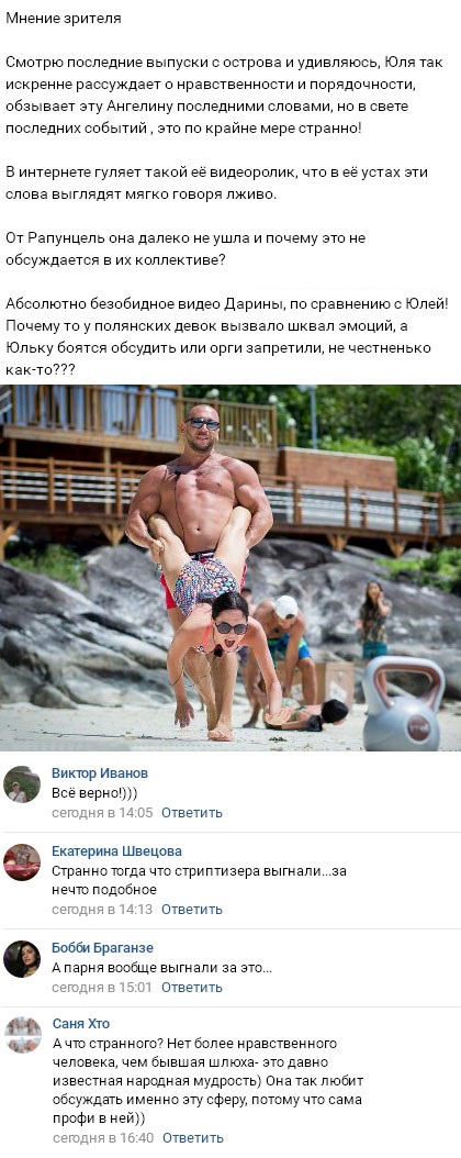 25 марта 2017 года фанаты реалити-шоу на основании некоторых событий сделали выводы о том, что организаторы проекта по каким-либо причинам прикрывают одну из участниц, а именно Юлию Ефременкову. Поклонники телестройки прекрасно помнят о том, с каким позорным скандалом был не так давно отправлен за пределы периметра Владимир Жиган. В тот момент многие, в частности, ведущие телешоу, крайне отрицательно отнеслись к нелицеприятному прошлому Владимира, оказавшегося коллегой Ольги Рапунцель по прежнему виду деятельности. Дарина Маркина также была жестко раскритикована за нескромные кадры, хотя ее видеозапись эротического характера напоминает детский лепет по сравнению с теми, которые имеют отношение к другим участникам проекта. Однако Юлию, также представшую перед всеми в весьма некрасивом свете, не постигла подобная участь. Вместо того чтобы сурово отчитать девушку, исполнявшую роль порно-модели, и даже изгнать ее с реалити-шоу, остальные участники помалкивают относительно Ефременковой, что заставляет предположить, что перед проектным коллективом эту молодую женщину прикрывают организаторы. Правда, пока неясно, по какой причине и с какой целью они это делают. Свое мнение о том, действительно ли Юлию Ефременкову прикрывают организаторы телестройки, вы можете высказать в комментариях.