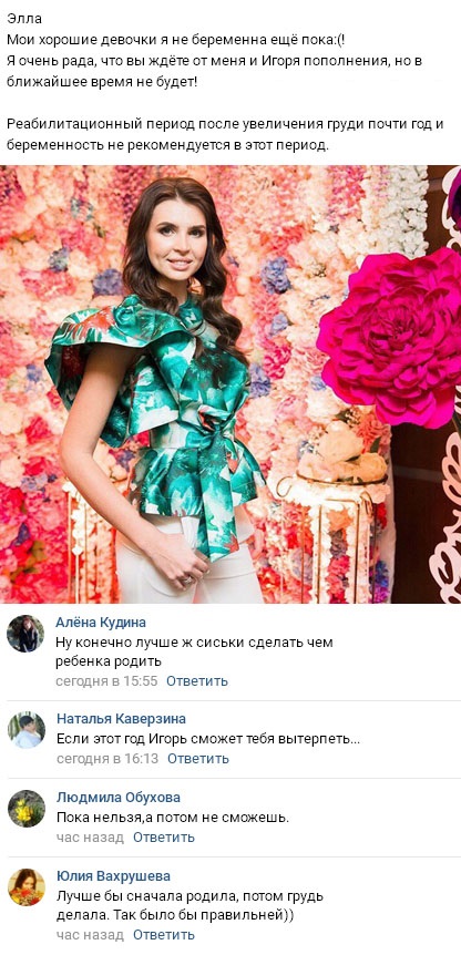 23 марта 2017 года Элла Суханова-Трегубенко призналась фанатам в своих проблемах в области деторождения. Элла и ее супруг Игорь Трегубенко оформили законный брак еще в период пребывания на телестройке. Уже в то время молодые люди абсолютно не скрывали того факта, что они вполне готовы к появлению детей и планируют в ближайшее время увеличить свою семью. При этом многие из поклонников решили, что эта пара оставила периметр именно в связи с «интересным положением» Эллы. К тому же она всегда говорила о том, что абсолютно не желает вынашивать и впоследствии растить малыша под постоянным наблюдением камер. Но ни тогда, ни сейчас Трегубенко так и не порадовали фанатов новостью о предстоящем рождении ребенка. Более того, теперь Элла перестала скрывать трудности, касающиеся зачатия. По словам самой Сухановой, она все еще не готовится стать матерью. Помимо этого, она недавно перенесла пластическую операцию груди, поэтому на протяжении, по крайней мере, года не может быть и речи о беременности. Свое мнение о ситуации с пополнением в семье Эллы Сухановой и Игоря Трегубенко вы можете высказать в комментариях.