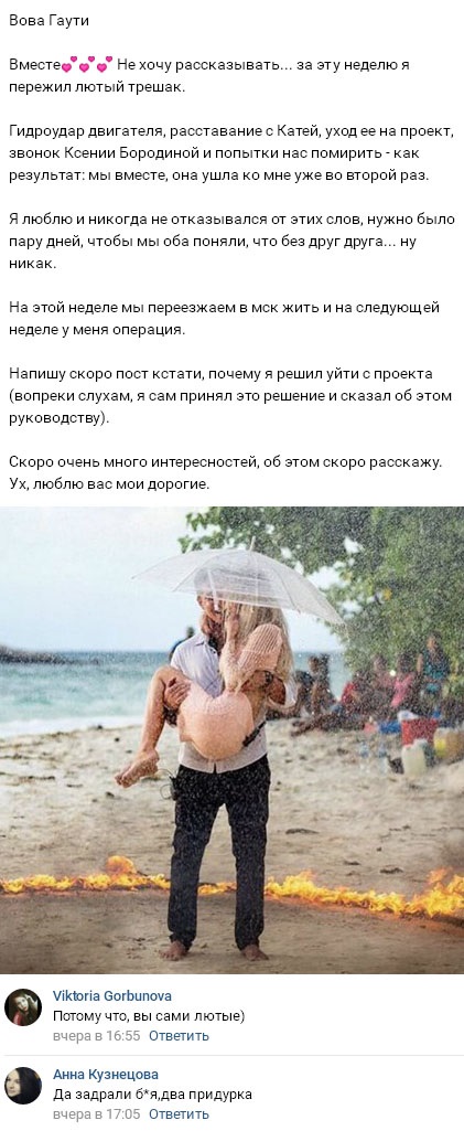 23 марта 2017 года Екатерина Гужвинская поспешно оставила периметр, получив перед этим звонок от телеведущей Ксении Бородиной. Многие были неприятно удивлены решением Владимира Гаути об уходе с реалити-шоу. К тому же Владимир завершил и отношения с Екатериной, отказавшись далее оставаться в числе участников телестройки. Это произошло уже после того, как Гаути все же решился сделать подруге официальное брачное предложение на Острове любви. Однако Ксения все же сумела примирить эту пару. После ее звонка Екатерина и Владимир смогли найти в себе силы для того чтобы поговорить и попытаться исправить ситуацию. Тем не менее, Гаути абсолютно не пожелал возвращаться на Поляну, в связи с чем Гужвинская была вынуждена уйти с проекта. При этом эти двое по-прежнему ничего не рассказывают о причинах их разрыва, точно так же они молчат и относительно причин, которые привели к отказу Владимира далее участвовать в телешоу. Свое мнение о том, что произошло с парой Екатерины Гужвинской и Владимира Гаути, вы можете изложить в комментариях.