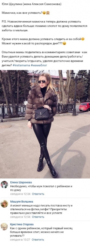 22 марта 2017 года Юлия Щаулина поделилась проблемами, возникшими у нее в связи с ее новым статусом молодой мамы, женщина даже обратилась за рекомендациями к поклонницам. Несколько дней назад Юлия, которая совсем недавно стала матерью, сообщила фанатам о том, что новорожденный Мирон чувствует себя не лучшим образом, а она сама и ее супруг Алексей Самсонов достаточно тяжело переносят ночи, фактически лишенные сна. Однако подписчики сумели успокоить женщину, объяснив ей, что ситуация нормализуется, как только будет устранена причина неважного сна и постоянных капризов малыша, которая заключается в коликах. Но и после этого совета материнство осталось для Щаулиной весьма непростой задачей. Теперь она вновь спросила у своих подписчиц, как им удается одновременно работать, учиться, заботиться о детях и муже и в то же время не забывать и об уходе за собой. По словам самой Юлии, она сама буквально ничего не успевает, в связи с чем просто не в состоянии полноценно насладиться своим новым статусом и выполнением соответствующих обязанностей.